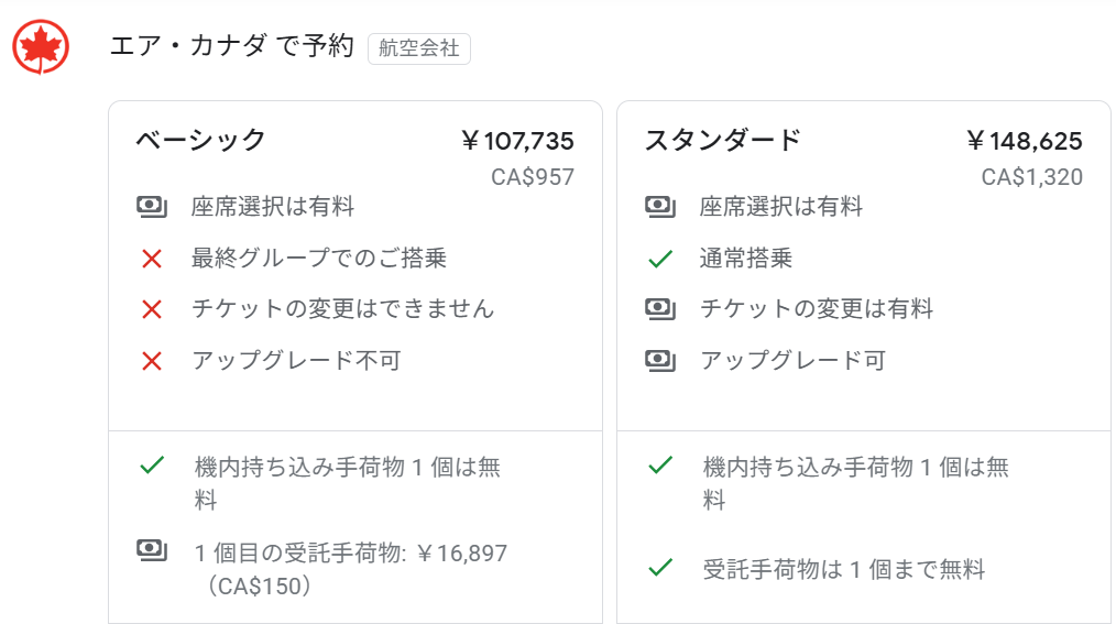 ただ注意点は、この価格はエアカナダのEconomy Basicプランを選択した際の価格です。このEconomy Basicは預入荷物が含まれていません。