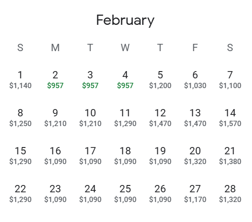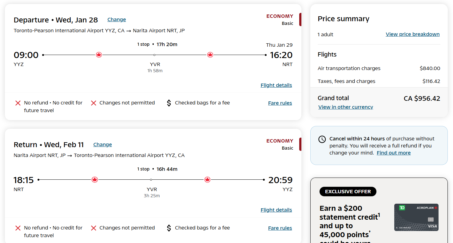 例えば2026年1月28日(水)~2月11日(水)で調べてみると、 $957のものが出てきました。(バンクーバー経由。エアカナダの公式ウェブサイトで、この価格で予約可能です)