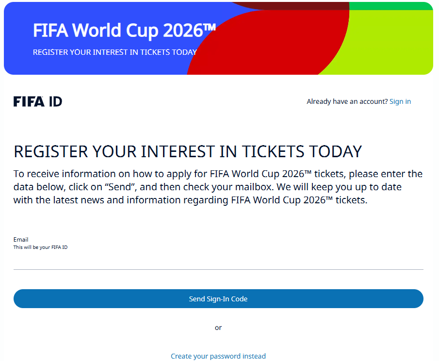 現在〈Register Your Interest〉(興味登録)を受け付けており、FIFA公式サイトからアカウントを作成して登録できます。登録では姓名、メールアドレス、居住地、性別、誕生日などを入力すれば登録できるので、チケット販売開始の情報を逃さないために、今から登録しておきましょう。
