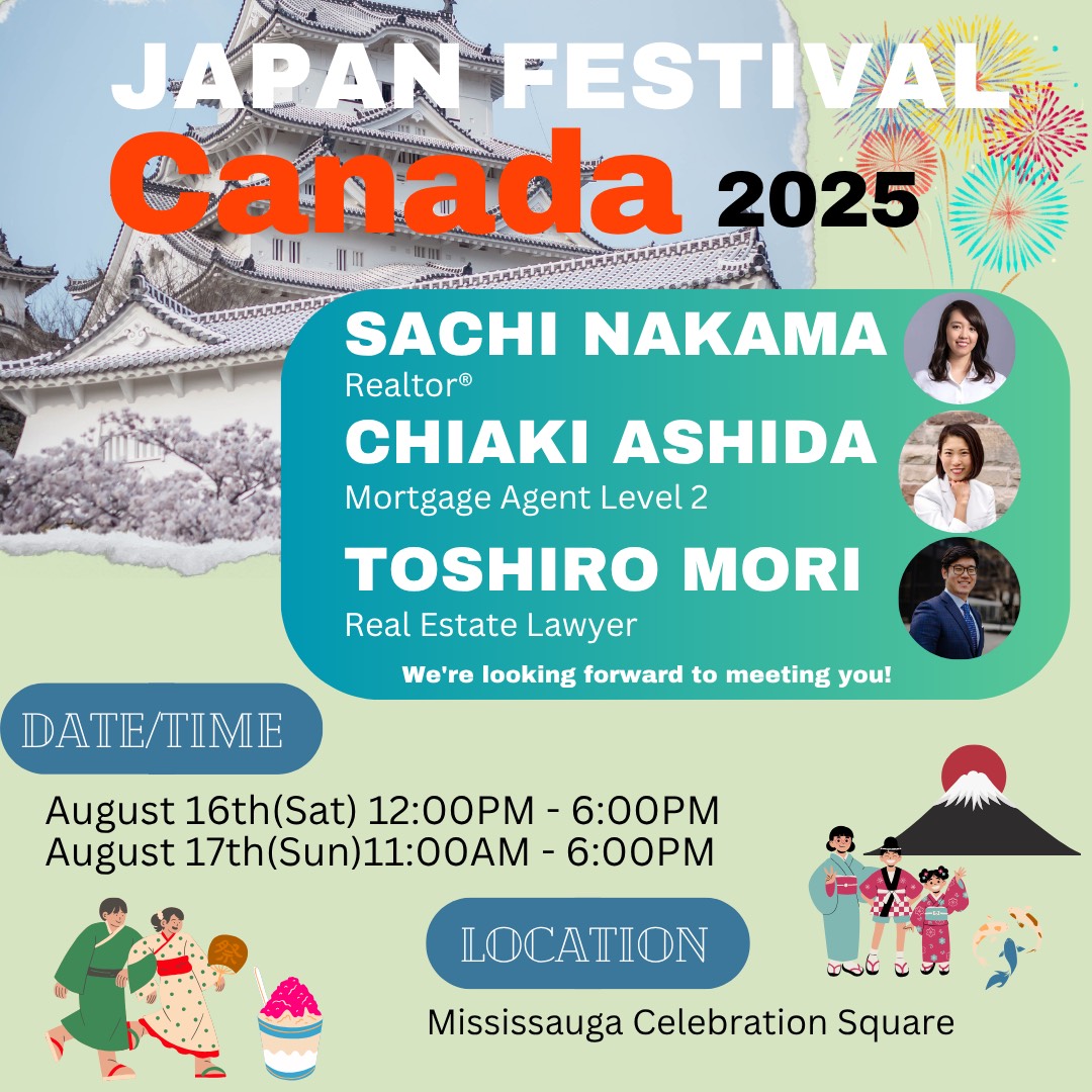 そんな Japan Festival Canada に、カナダ・オンタリオ州のリアルター、モーゲージエージェント、不動産弁護士という、不動産の専門家である日本人3人が一緒にブースを出すことを皆さんご存知でしょうか?