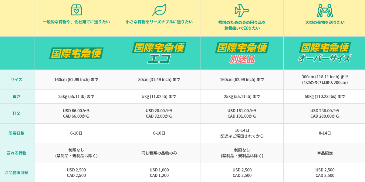 ちなみに、小さな荷物をリーズナブルに送ることができる「国際宅急便エコ」、大型の荷物を送ることができる「国際宅急便オーバーサイズ」というサービスもありますよ。