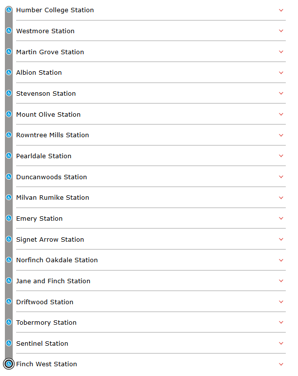 ※午後10時〜午前1時までは、Finch West通りにある路面LRT停留所を巡回する Line 6シャトルバス(10分間隔) が運行します。午前1時以降〜始発までは 336 Finch West Blue Night が運行します。