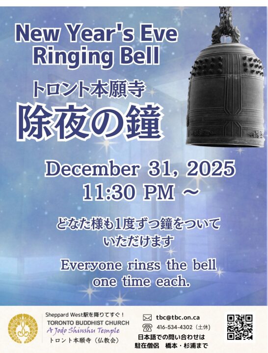 今年も1年の締めくくりとして、12月31日大晦日は「除夜の鐘つき」がトロント本願寺にて行われます。11:30pmから一人一回ずつ鐘をつきます。誰でも参加できますよ。