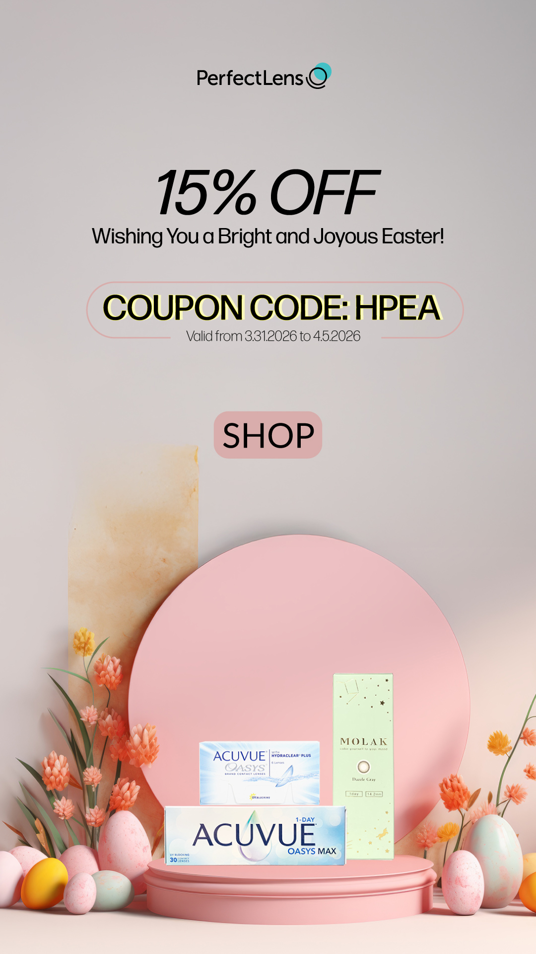 PerfectLensからイースターセールとして、期間限定のコンタクトレンズクーポンが発表。購入金額から 15%オフです!
